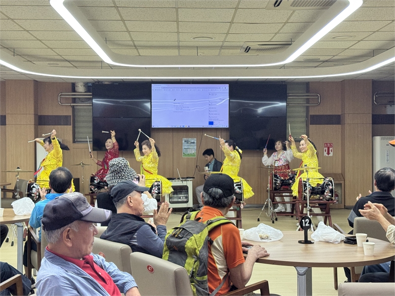 ▲ 아랑 고고장구팀’ 공연 현장. 어르신들이 즐겁게 관람하며 박수를 보내고 있다. (사진제공=황혜영 기자)