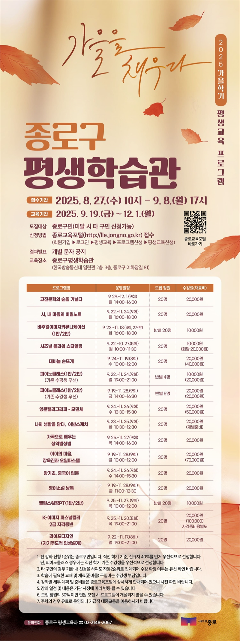 2025 종로구 가을학기 평생교육 프로그램 안내 (사진제공 = 종로 교육 포털 https://lle.jongno.go.kr)home종로교육포털,home, 종로교육포털https://lle.jongno.go.kr